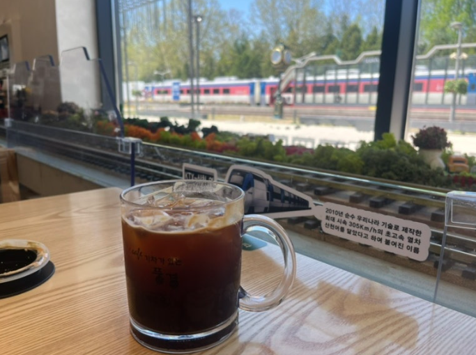 미니 기차가 음료를 배달하는 독특한 콘셉트로 아이와 함께 가기 좋습니다.