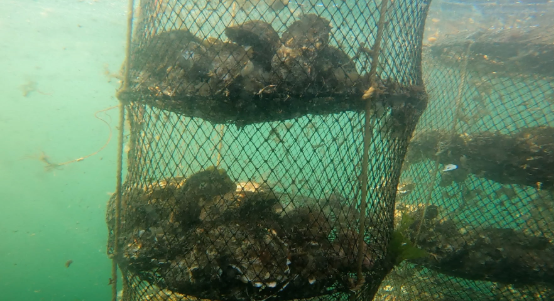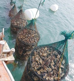 고성에서 자라는 개체굴은 일반 굴과 양식 방식부터 다릅니다. 길게 매단 줄에 붙여 키우는 방식이 아니라, 굴 하나하나가 서로 부딪히지 않도록 그물망 안에서 낱개로 자라게 됩니다.