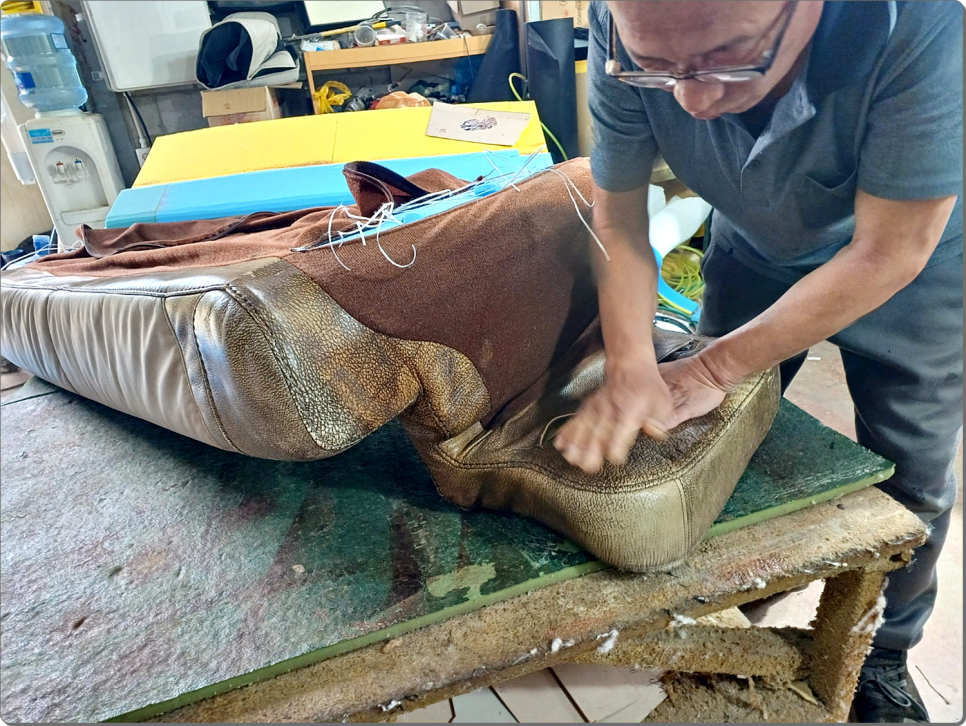 이곳의 가장 큰 특징은 모든 공정을 100% 수작업으로 진행한다는 점입니다. 기존 소파를 완전히 분해한 뒤, 벗겨낸 원단을 그대로 패턴 삼아 새로운 가죽이나 패브릭을 재단하고, 한 땀 한 땀 재봉해 원래의 형태를 정확하게 복원합니다.