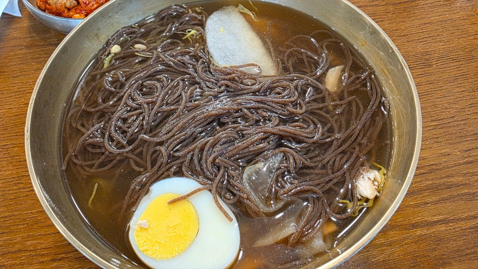 씹을수록 은은하게 퍼지는 메밀 향과 과하지 않은 식감은 맑은 육수와 자연스럽게 어우러지며, 이북식 평양냉면 특유의 담백함을 온전히 전달합니다.