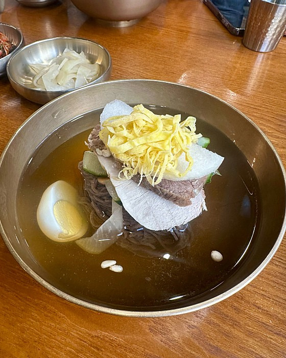 고려 물냉면의 국물은 자극적이지 않고 차분합니다. 첫맛은 담담하지만, 한 숟갈씩 음미할수록 재료에서 우러난 깊이가 서서히 쌓이며 어느 순간 자연스럽게 빠져들게 됩니다.