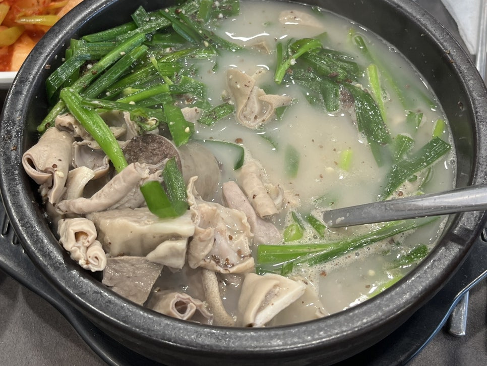 이곳의 피순대국밥에는 염통, 곱창, 감투 등 돼지 특수부위가 푸짐하게 들어가 있어 내용물의 만족도가 매우 높습니다. 여기에 부추를 듬뿍 올려 함께 먹으면 느끼함은 잡아주고 향긋함은 더해져 한 그릇을 끝까지 맛있게 즐길 수 있습니다.