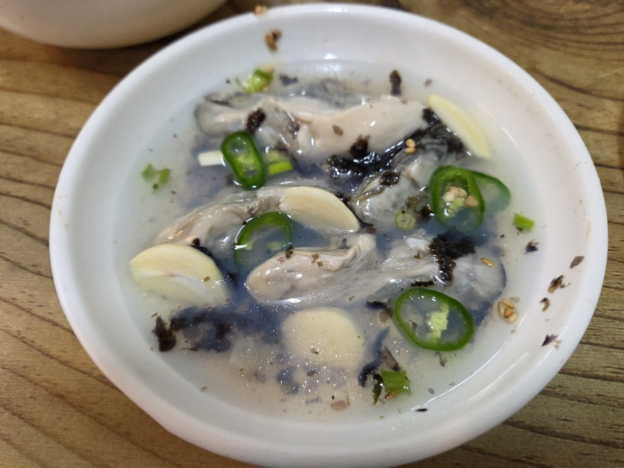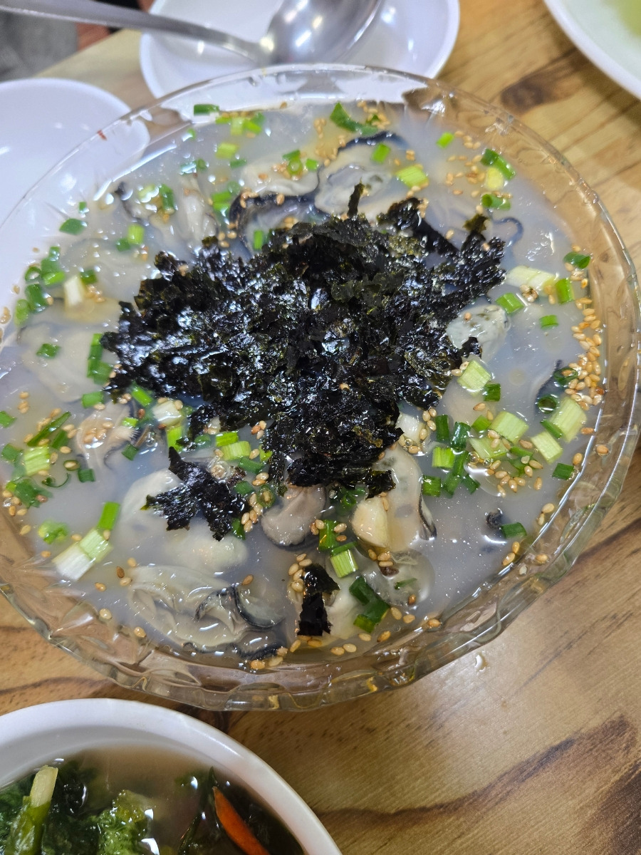국물은 담백하면서도 깊고, 굴 특유의 바다 향이 과하지 않게 퍼져 한 숟갈만 떠도 겨울 바다의 정취가 그대로 전해집니다. 여기에 실파, 김가루, 참기름과 깨소금이 더해지며 고소함과 감칠맛이 자연스럽게 어우러집니다.