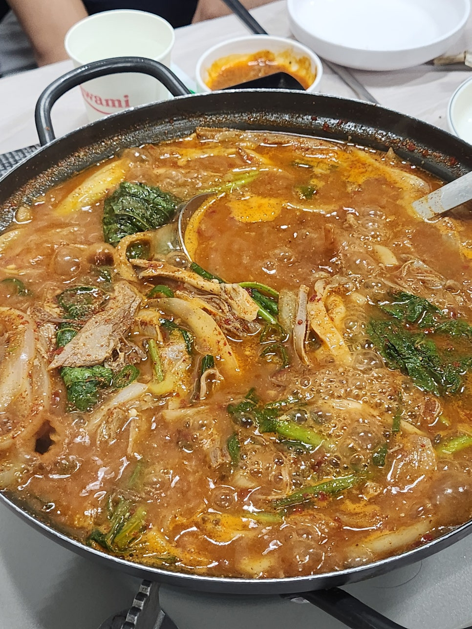운봉산장의 대표 메뉴는 단연 양갈비전골입니다. 빨간 국물이 시선을 사로잡는 이 전골은 냄비가 테이블에 올라오는 순간부터 깊고 진한 향으로 분위기를 압도합니다.