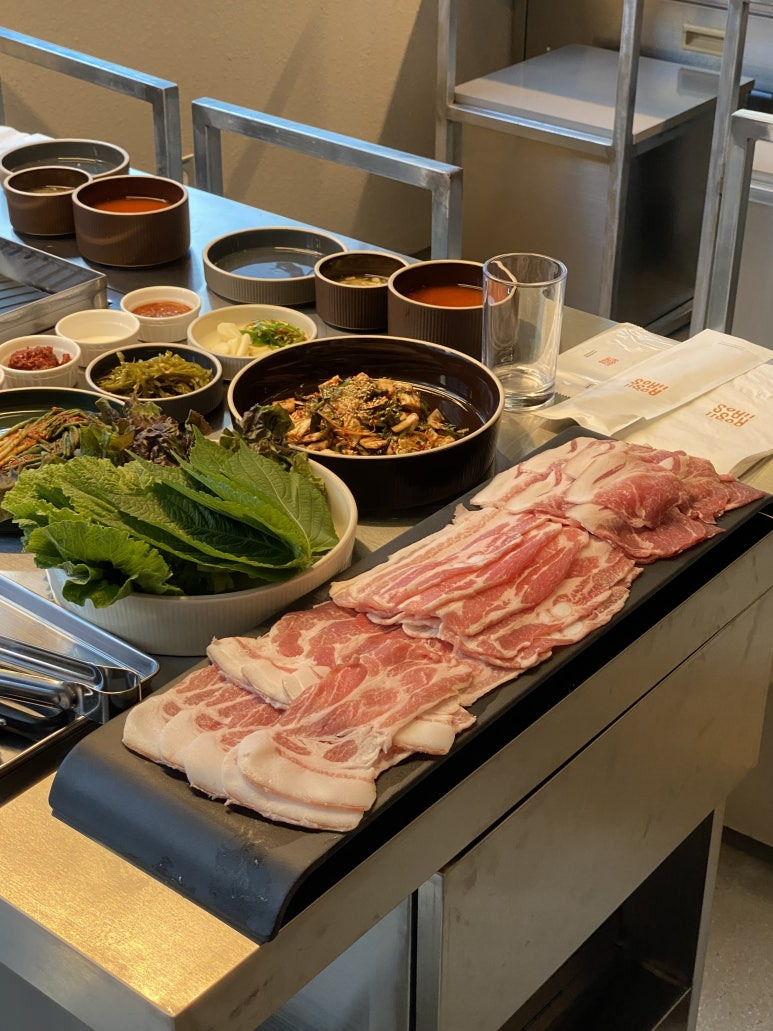얇게 썰린 덕분에 가장 맛있는 타이밍을 놓치지 않고 즐길 수 있고, 전문 서버가 직접 구워주는 방식이라 처음 방문하는 분들도 최상의 맛을 그대로 경험하실 수 있습니다. 불판 위에서 노릇하게 익은 고기를 한 점 입에 넣는 순간, 돼지고기에 대한 인식이 달라졌다는 손님들의 반응이 결코 과장이 아님을 느끼게 됩니다.