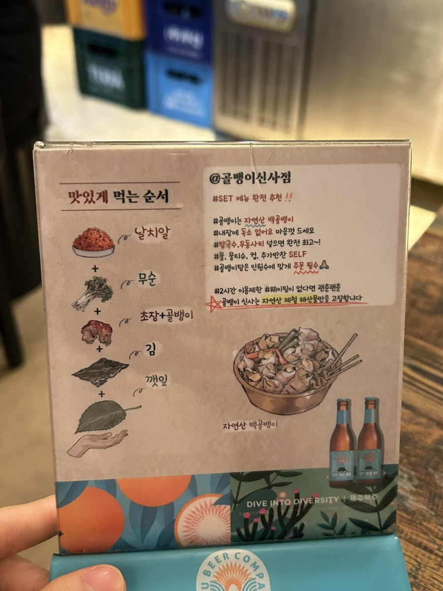 테이블마다 골뱅이를 쉽게 발라내는 방법이 안내되어 있어 누구나 부담 없이 즐길 수 있으며, 남은 국물에 김치칼국수 사리를 추가해 마무리하는 코스는 많은 손님들이 극찬하는 필수 선택지로 자리 잡았습니다.