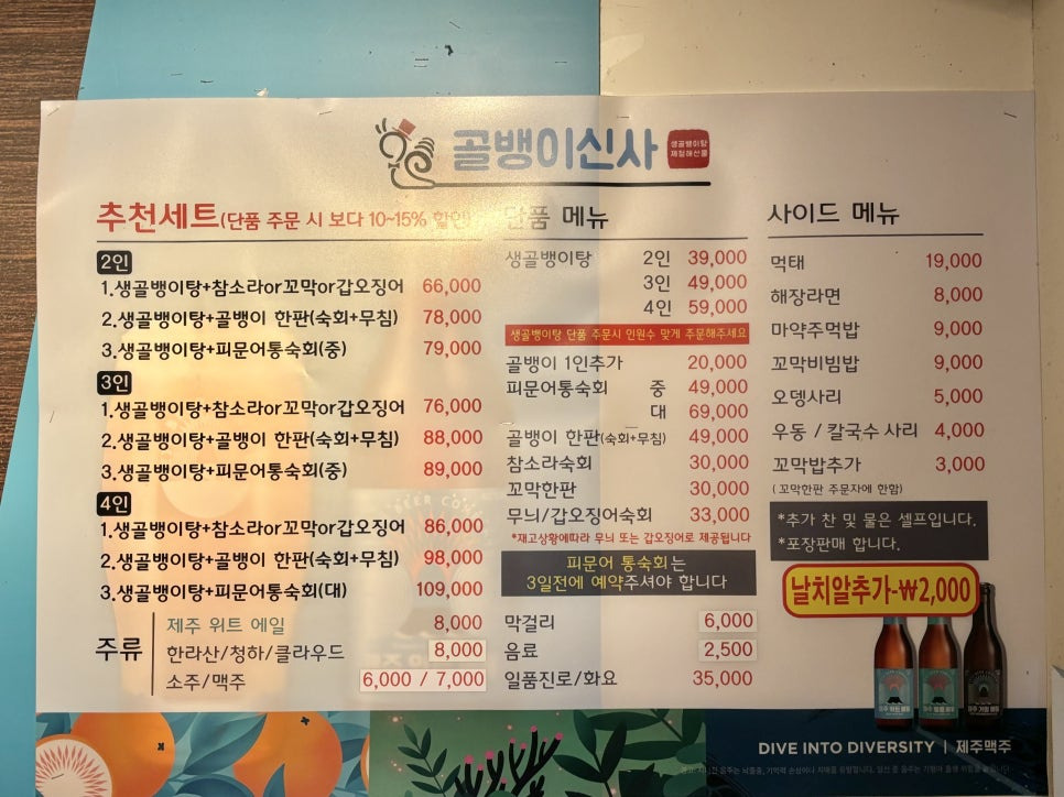메뉴 구성 또한 알차게 준비되어 있습니다. 대표 메뉴인 생골뱅이탕 2인은 39,500원으로 푸짐한 양과 깊은 맛을 자랑하며, 돌문어통숙회 중 사이즈는 49,000원으로 야들야들한 식감이 인상적입니다.