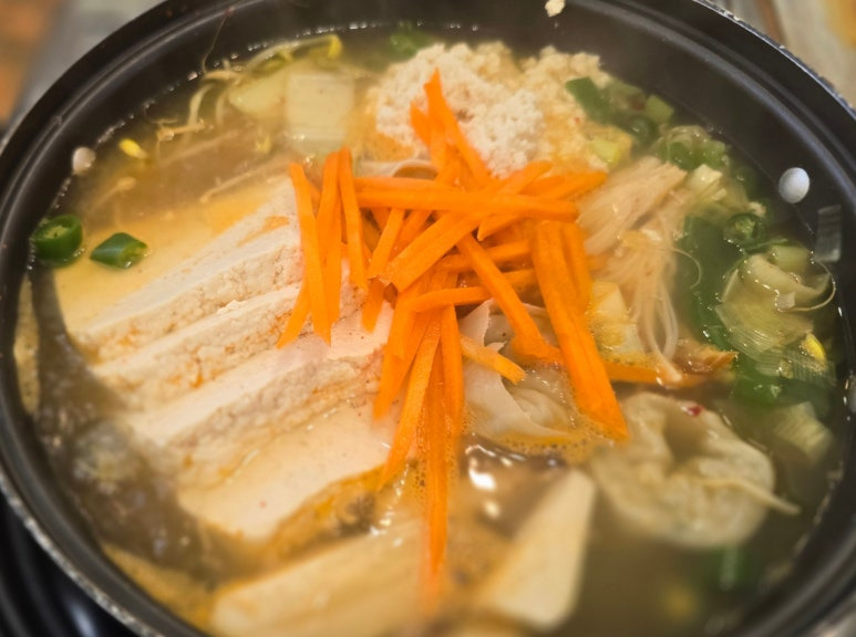 두툼하게 썰린 손두부는 쉽게 부서지지 않으면서도 입안에서는 부드럽게 풀어져, 전골 한 그릇만으로도 충분한 만족감을 줍니다.