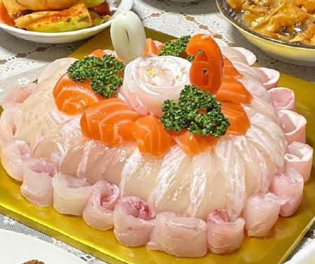 바로 회를 ‘케이크’라는 형태로 재해석한 것입니다. 방송에 등장한 회케이크는 한눈에 봐도 시선을 사로잡는 비주얼을 자랑했습니다. 생크림과 시트 대신, 신선한 제철 생선회가 층층이 쌓여 있어 마치 예술 작품을 보는 듯한 인상을 주었습니다.