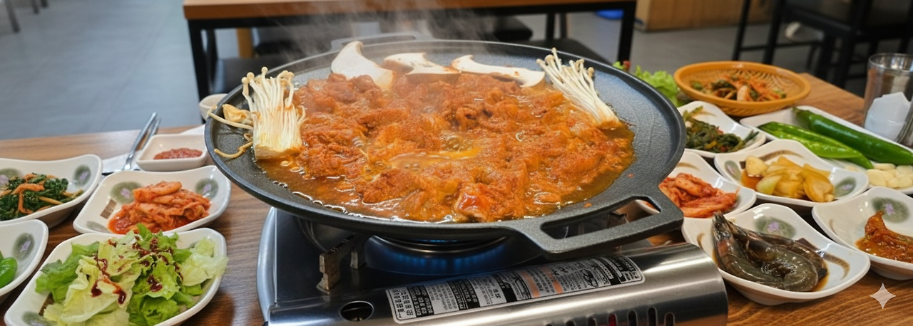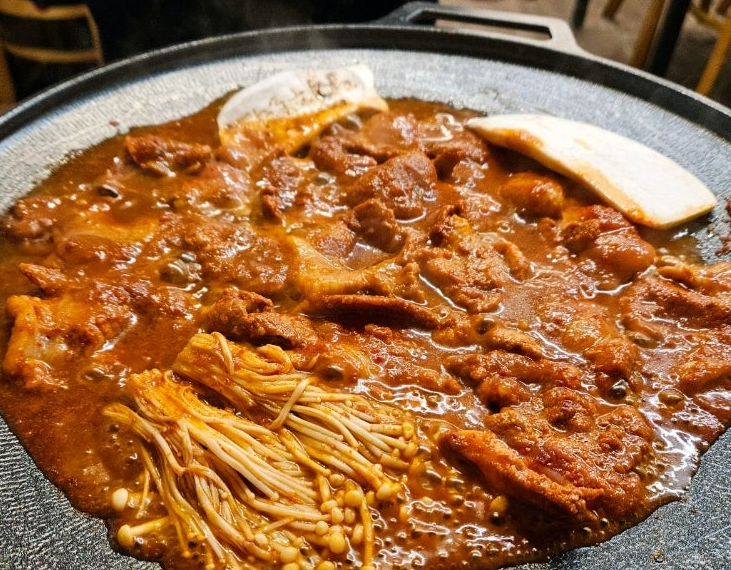 고추장 돼지주물럭은 텁텁함 없이 깔끔한 매콤함이 살아 있으며, 인위적인 단맛보다는 고기와 채소에서 우러나오는 자연스러운 감칠맛이 중심을 잡아줍니다. 불판 위에서 지글지글 익어가는 동안 퍼지는 고추장 향은 식욕을 단번에 자극합니다.