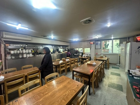 내부는 세월의 흔적이 느껴지는 소박한 분위기지만, 테이블 간 간격이 넉넉하고 좌석 수가 많아 혼자 식사하는 손님부터 직장 동료들과 함께 방문한 단체 손님까지 편안하게 이용할 수 있습니다.