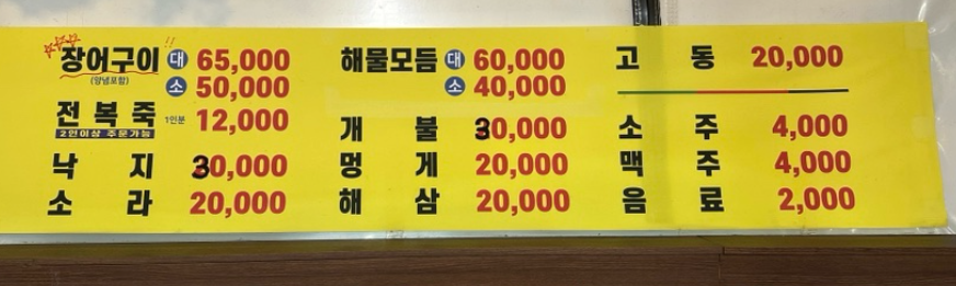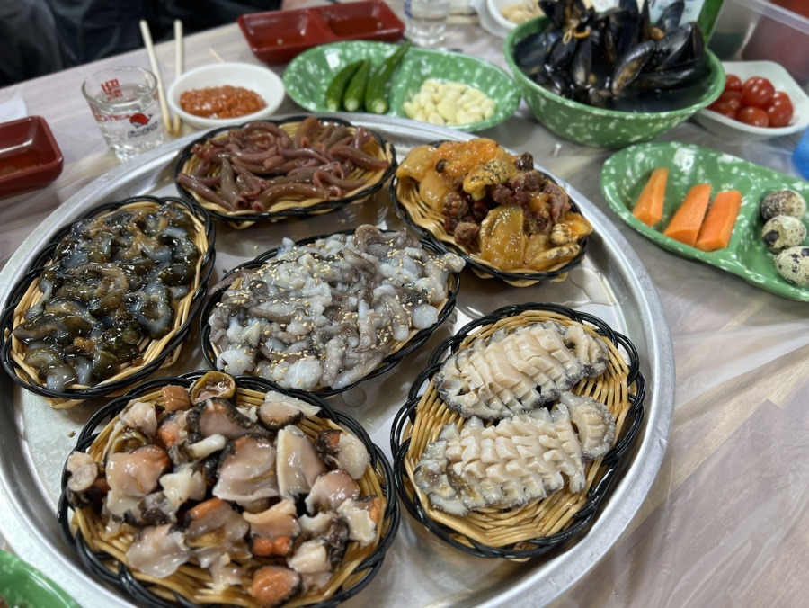 가게 내부는 의자식 테이블 위주의 전형적인 해녀촌 포장마차 분위기입니다. 화려하거나 세련된 인테리어는 아니지만, 오히려 항구의 생활감이 그대로 묻어 있어 더 정겹게 느껴집니다.