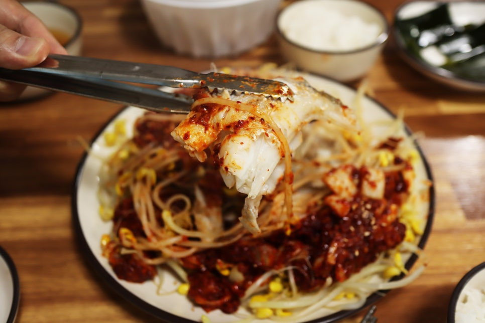 이 집의 대구뽈찜은 접시 구성부터 눈길을 끕니다. 바닥에는 아삭한 콩나물이 듬뿍 깔려 있고, 그 위에 통통한 대구 뽈살과 양념이 얹혀 나오는 방식입니다.