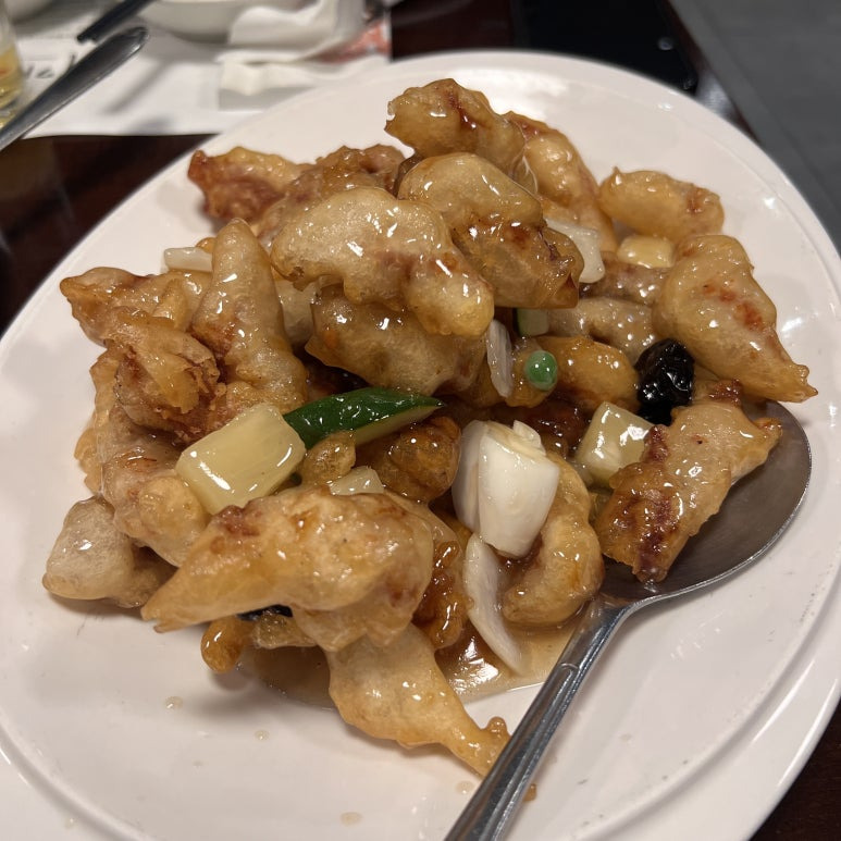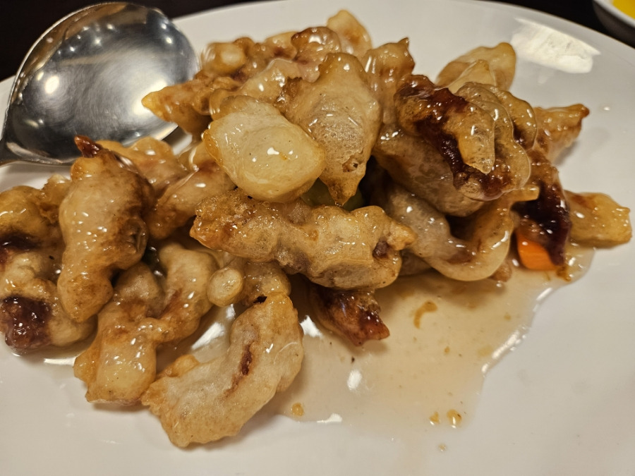 일반적인 탕수육과 달리 소스를 따로 제공하지 않고, 처음부터 소스를 부어 볶아낸 형태로 나옵니다. 그럼에도 불구하고 튀김옷은 바삭함을 유지하고, 속살은 촉촉하고 부드러웠습니다.