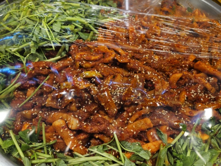 특히 미나리가 듬뿍 들어가 상쾌한 향을 더해 주기 때문에, 양념의 맛이 강해도 부담스럽지 않고 오히려 더 조화롭게 느껴집니다. 신선한 야채가 함께 어우러지며 씹는 재미가 살아 있고, 묵은지와 함께 곁들이면 특유의 시원함과 감칠맛이 더해져 더 깊이 있는 풍미를 느끼실 수 있습니다.